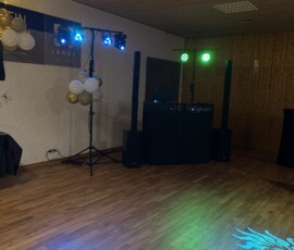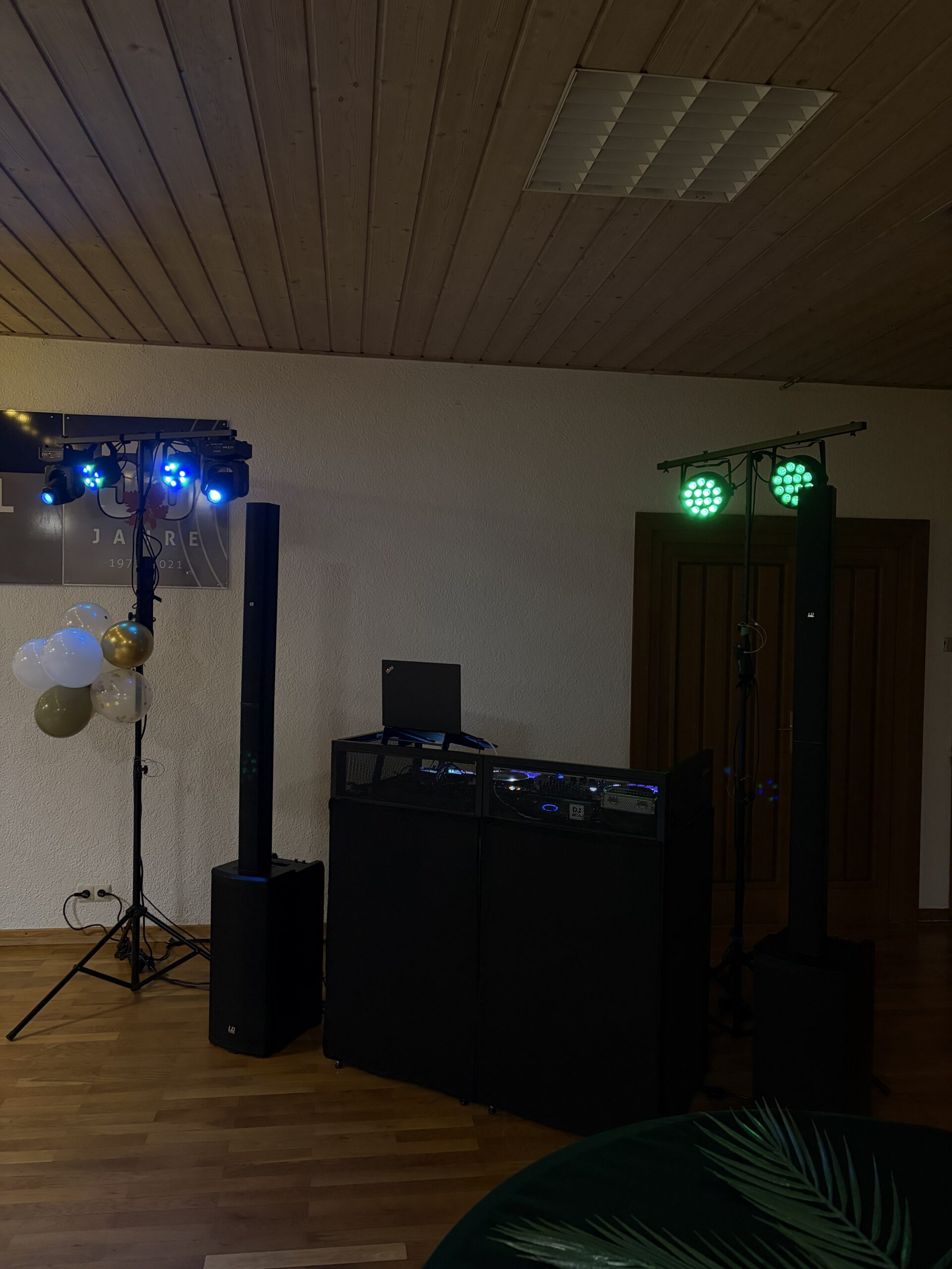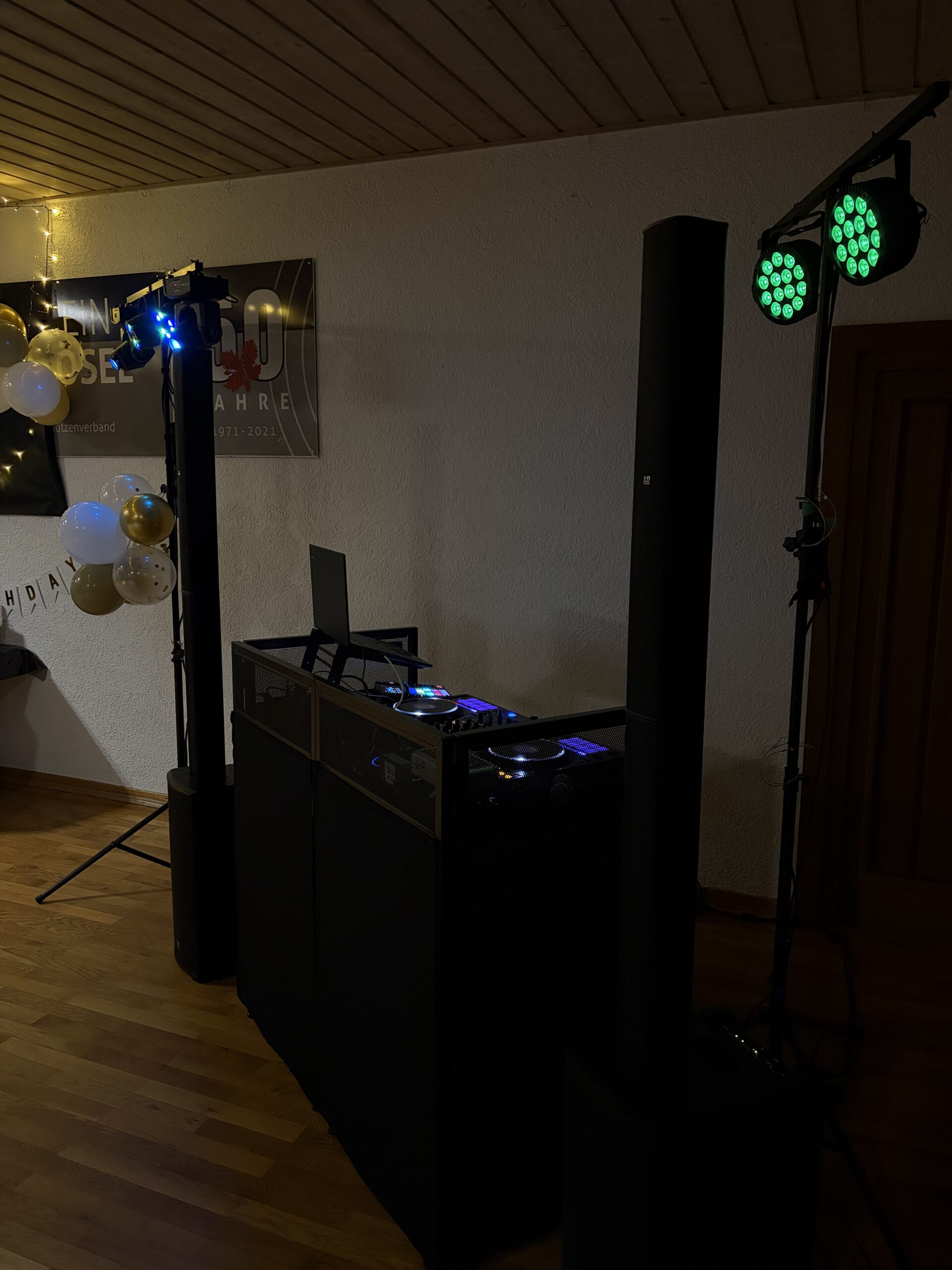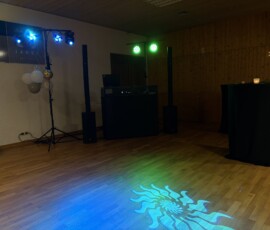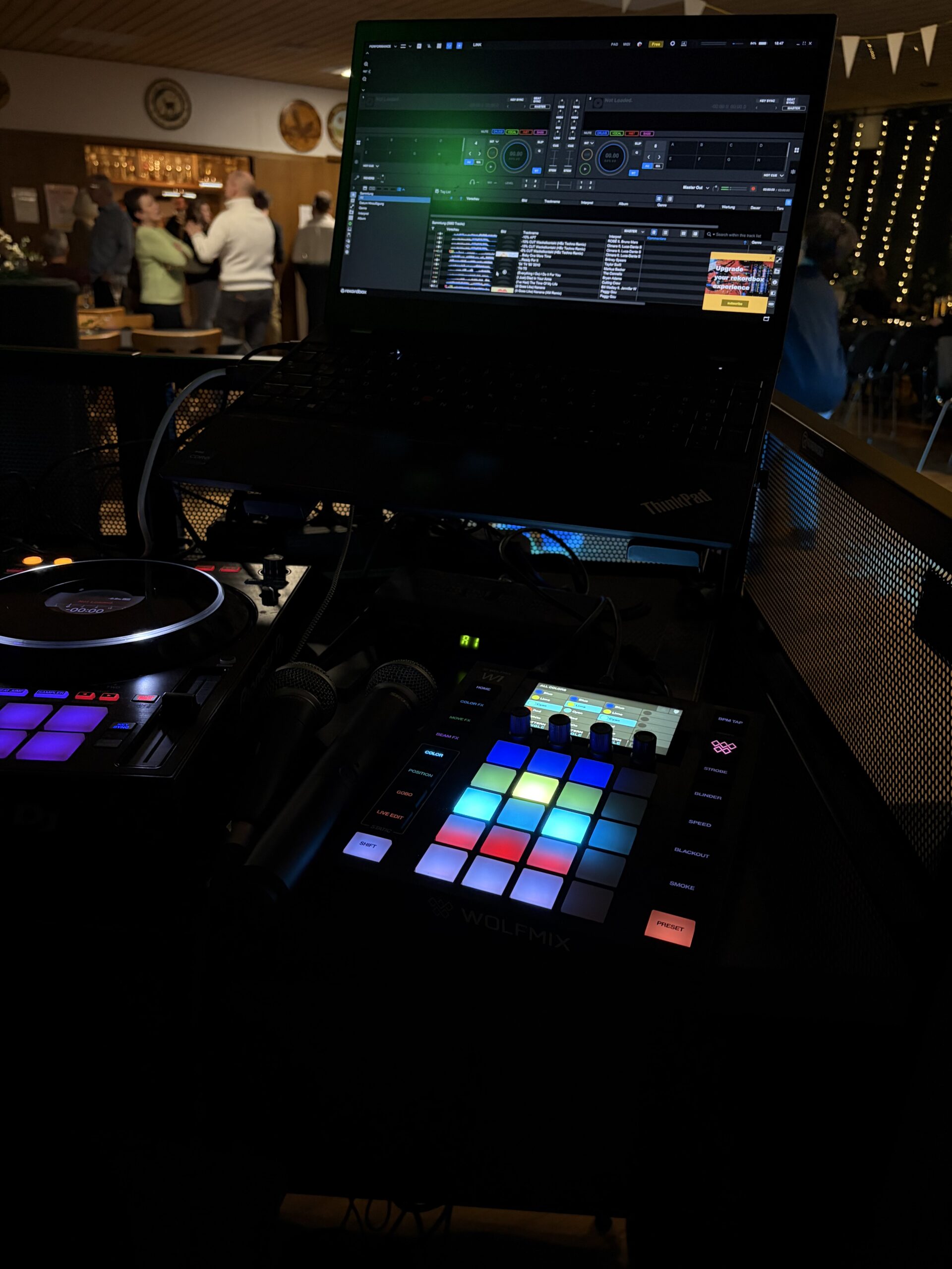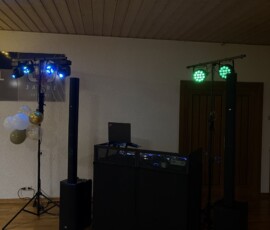 Lichtsetup mit 2 Moving Heads (Spots) sowie 6 LED Strahlern inkl. Ständern und Nebelmaschine gesteuert mit einer der besten Lichtsteuerungsmöglichkeiten für DJ’s, dem Wolfmix. Das Lichtsetup ist perfekt für jede Party, da es schnell aufgebaut ist, jedoch trotzdem eine super Partyatmosphäre aufbringt.