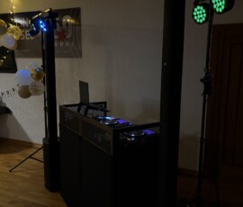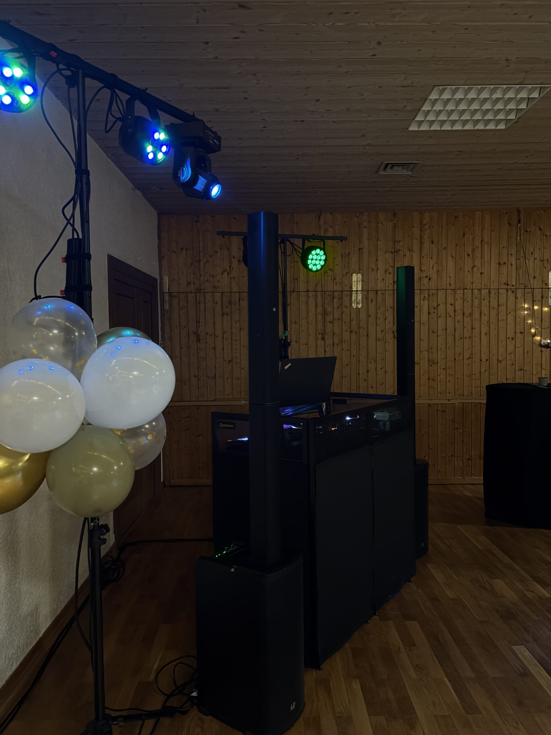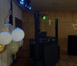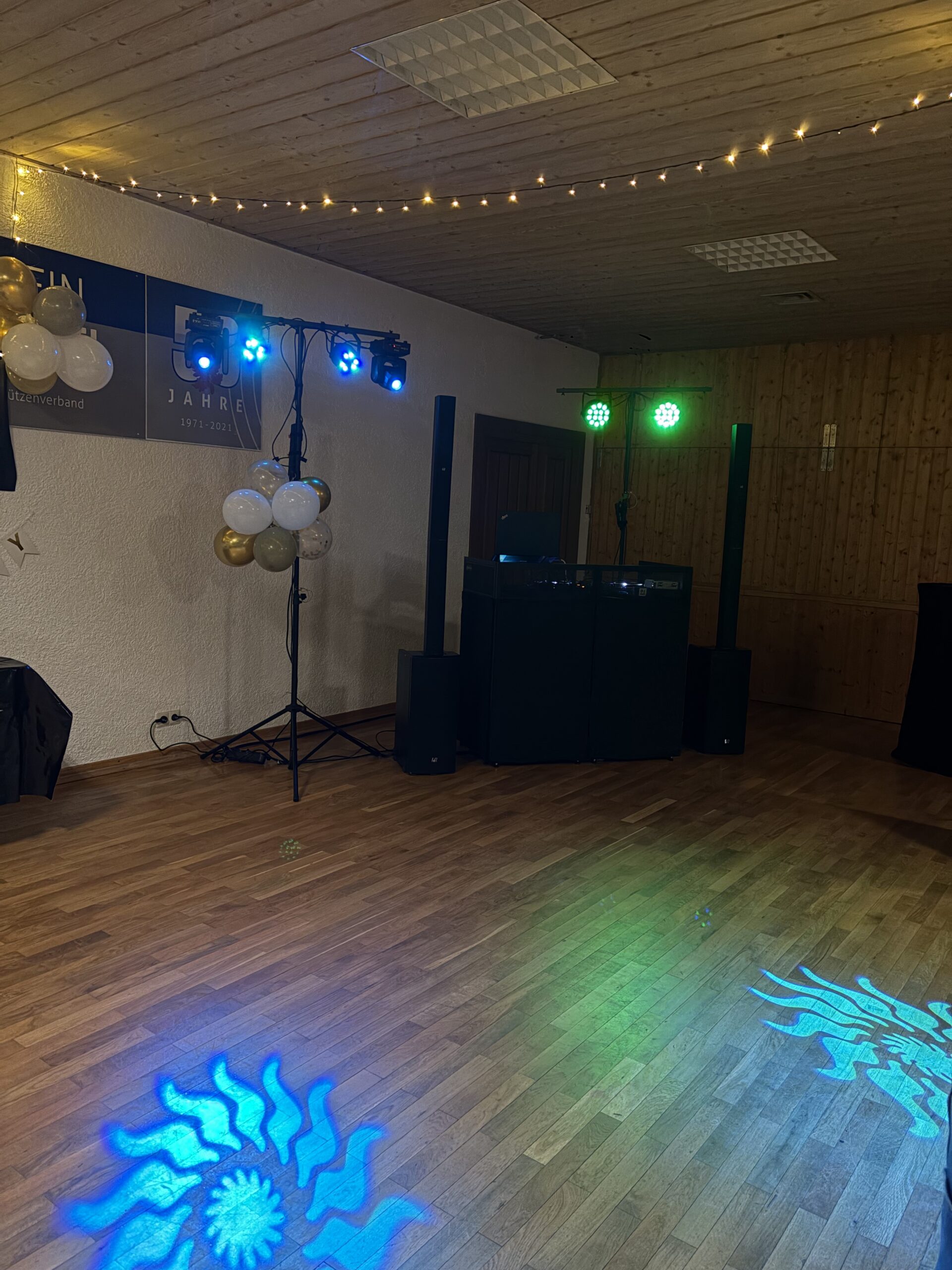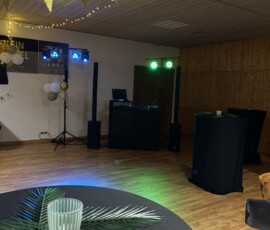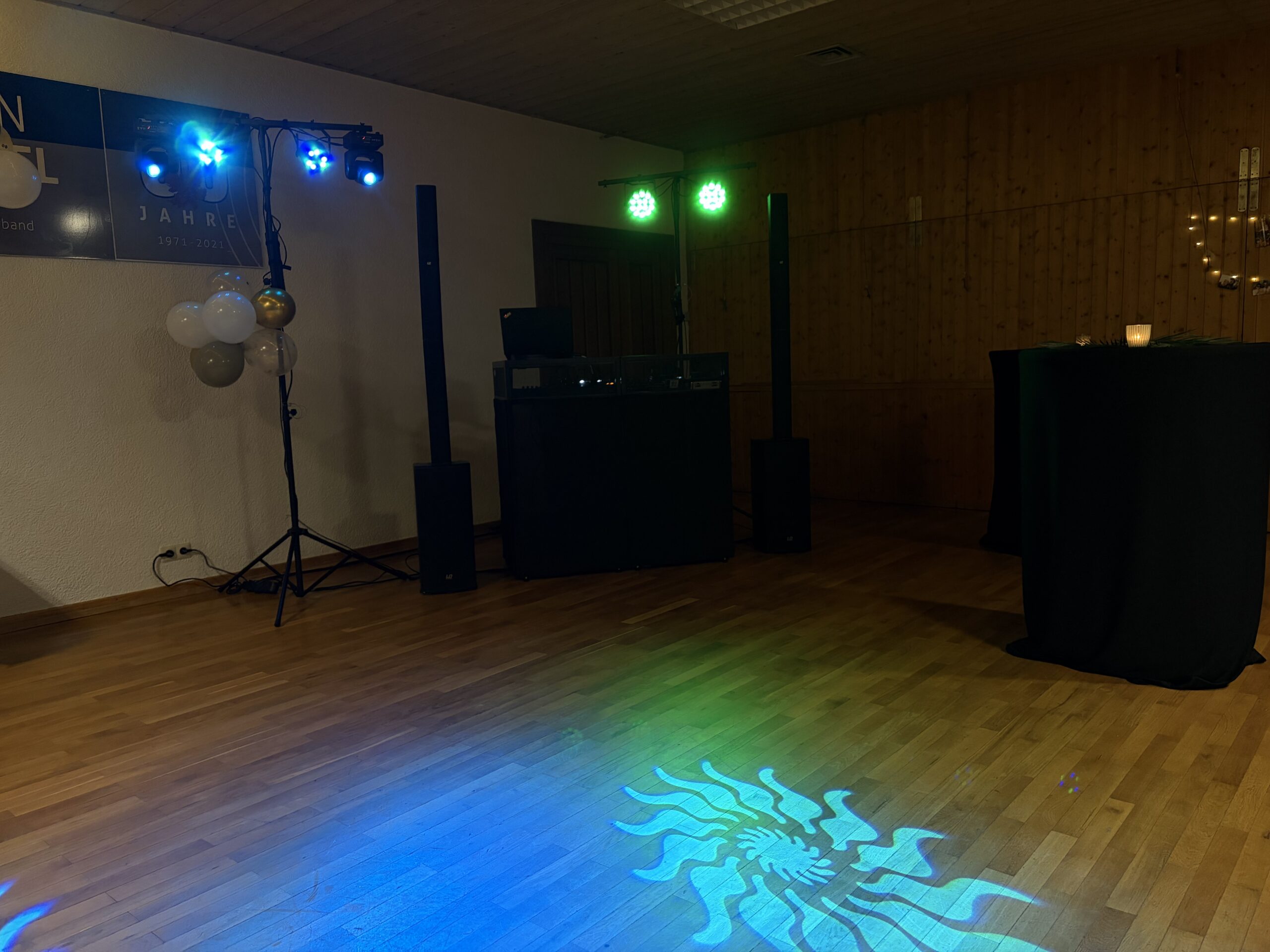 Lichtsetup mit 2 Moving Heads (Spots) sowie 6 LED Strahlern inkl. Ständern und Nebelmaschine gesteuert mit einer der besten Lichtsteuerungsmöglichkeiten für DJ’s, dem Wolfmix. Das Lichtsetup ist perfekt für jede Party, da es schnell aufgebaut ist, jedoch trotzdem eine super Partyatmosphäre aufbringt.